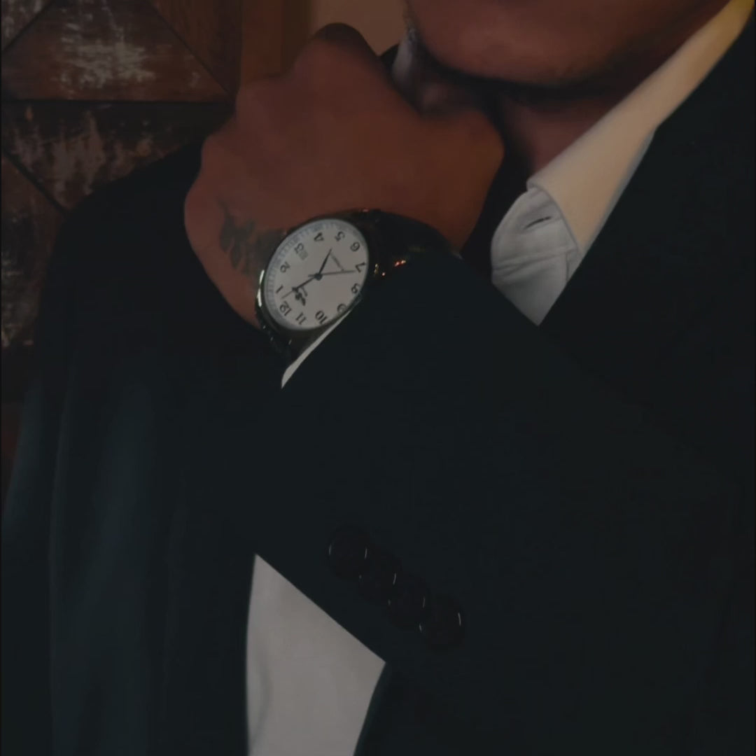 Seu mostrador organizado e a construção em aço polido revelam rigor formal, enquanto o movimento automático sustenta presença constante e segura.
